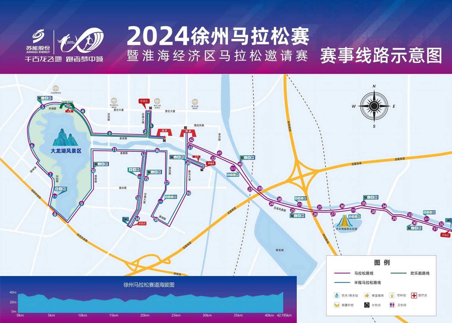 马拉松:城市阳台(起点) — 新安路 — 汉源大道(折返) — 新安路 — 环湖路 — 商聚路 — 天目路 — 迎宾大道 — 楚韵路 — 富春路 — 汉源大道(折返) — 富春路 — 清风路 — 潇湘路 — 新元大道 — 富春路(折返) — 新元大道 — 新安路 — 吕梁风景路(折返) — 新元大道 — 镜泊路学校(终点)